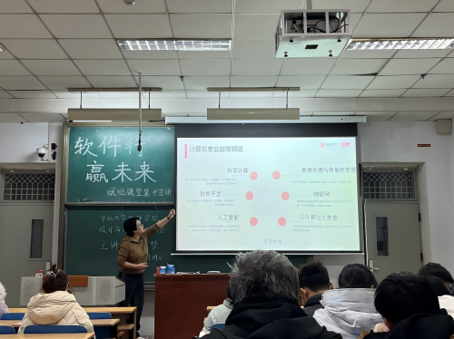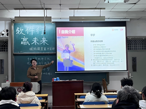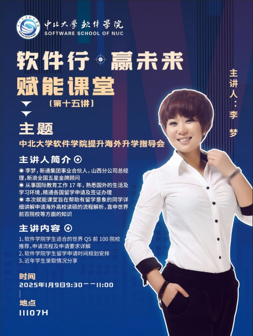 在11107H教室成功举办了“软件行·赢未来”赋能课堂第十五讲——提升海外升学指导会。本次讲座特邀具有17年国际教育工作经验的新通集团山西分公司总经理李梦担任主讲,30余名意向海外升学的学生聆听了讲座,会议由就业辅导员乞国钰主持。