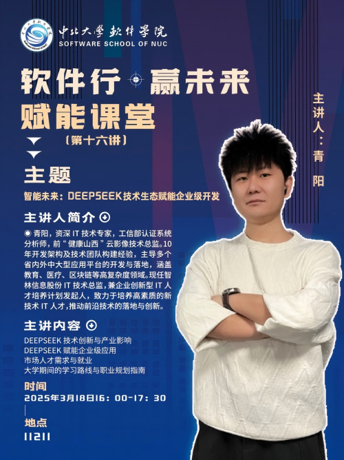 在11211H教室成功举办"'软件行·赢未来'赋能课堂第十六讲——智能未来:DeepSeek技术生态赋能企业级开发"专题讲座。本次讲座特邀智林信息资深IT技术专家青阳担任主讲,乞国钰主持。