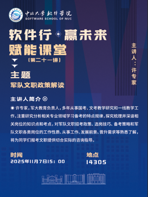 主办的“‘软件行·赢未来’赋能课堂第二十一讲——军队文职政策解读讲座”在14305H教室成功举办。本次讲座特邀军大教育资深专家许老师主讲,他深耕国考与军队文职招考教学研究及一线教学工作多年,对军队文职招考政策、选岗技巧、备考策略及各类岗位情况有着深入洞察。围绕“军队文职政策深度解读与职业发展规划”这一核心主题,讲座吸引了众多师生到场参与。