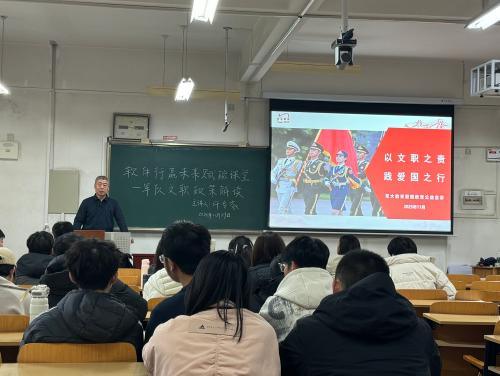 宣讲会上,许老师以国际视角开篇解析军队文职制度,指出其并非中国特有,而是与士兵、军官并列的世界发达国家武装力量三大基础支撑要素,他以德国国防部长鲍里斯・皮斯托里乌斯、美国国防部长海格塞斯为例,介绍发达国家军队中文职人员规模通常达现役员额一半以上,为师生揭开其“国际化面纱”;在福利待遇方面,他重点解读医疗保险政策,强调文职人员可享国家和军队双重医疗补助与保健待遇,参与相关军事行动期间实行军队免费医疗,同时依法参加社会保险,军队还会建立补充保障并为重要岗位人才购买专项保险,让师生直观感受到岗位稳定性;针对报考环节,许老师梳理了报考、笔试、面试、体检和入职的完整流程,清晰的时间节点为有意向报考的学生指明备考节奏,助力科学规划备考周期。
