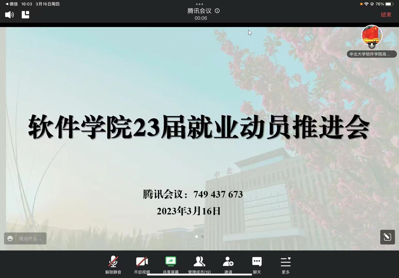 在腾讯会议召开了2023届毕业生线上春季就业工作推进会,学院党委副书记兼副院长高宏图、9家实训企业就业负责人、就业辅导员乞国钰参加了会议。
