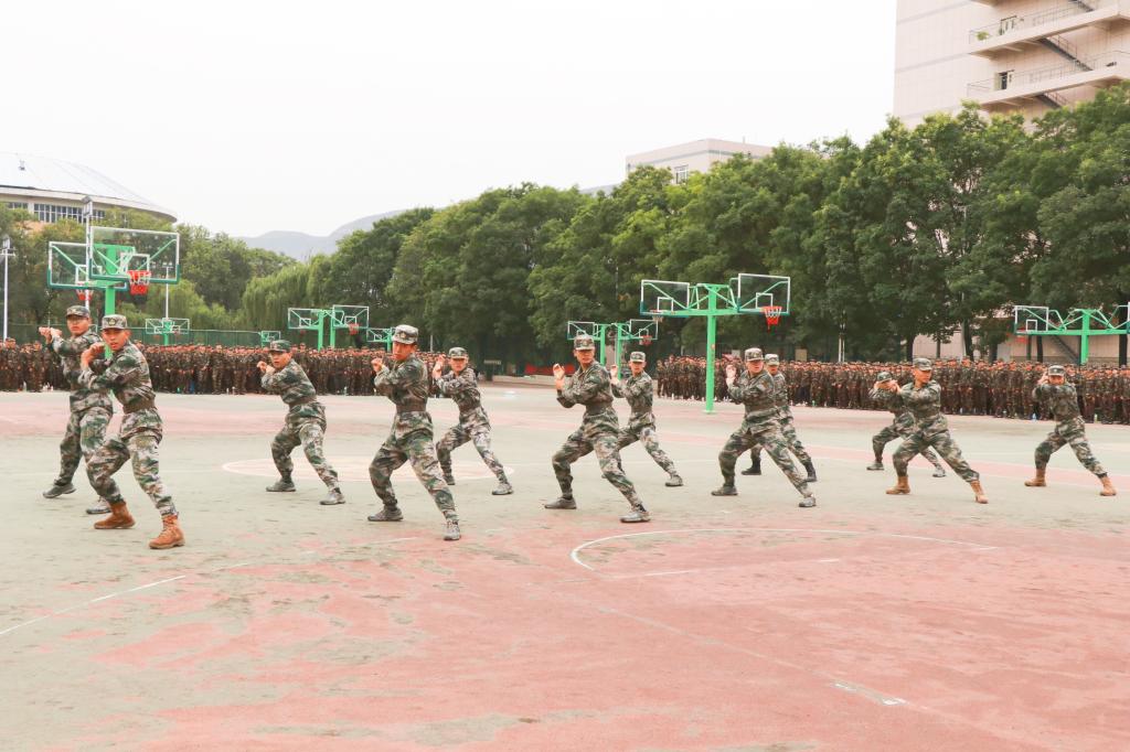 教官进行队列展示和擒敌拳展示,他们整齐划一的队列动作、坚定专注的神情完美诠释了军人特有的英姿风采,给在场的同学们起到了很好的示范作用。在全体同学集体齐唱《强军战歌》《国歌》的嘹亮歌声中此次军训动员大会圆满结束。