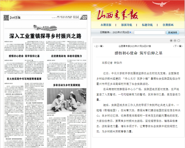 团委在校团委的帮助和指导下,立足本院中心工作,遵循育人理念,紧扣时代主题,大力推进大学生社会实践活动,进一步发挥共青团第二课堂活动和社会实践工作在“全员育人、全过程育人、全方位育人”的重要作用,2023年度学院暑期实践取得丰硕成果,与汾西县政府共建实践基地1个,在中青在线、山西青年报等重要媒体刊发调研报告、新闻稿件20余篇,实践课题转化申报“挑战杯”大学生课外学术科技作品获山西省二等奖1项,在社会影响力、覆盖面和育人效果方面取得良好成效。