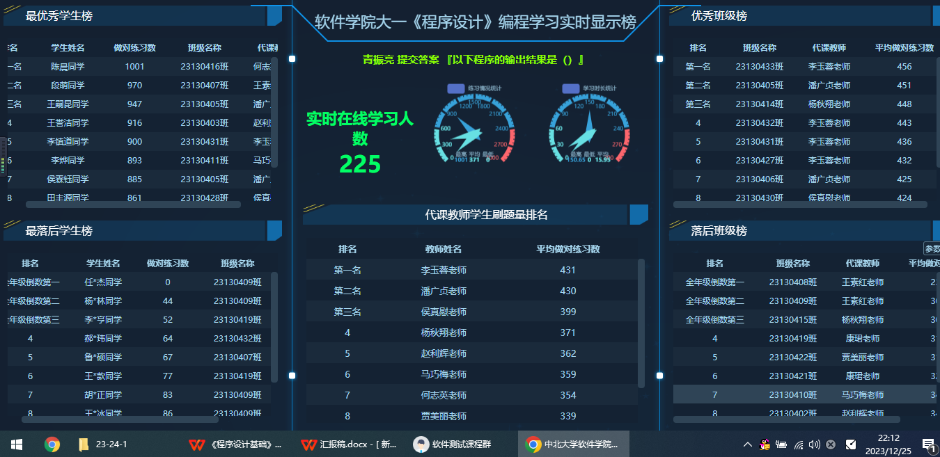 设置在主楼一层的电子公告屏,24小时动态显示1600余名学生对该课程的题库进行练习的实时更新,学生刷题量排名情况等;通过后台数据比对及跟踪,发现深夜11:00仍有300余名学生在线刷题;该举措极大地调动了学生主动学习的积极性,目前取得了良好的效果。