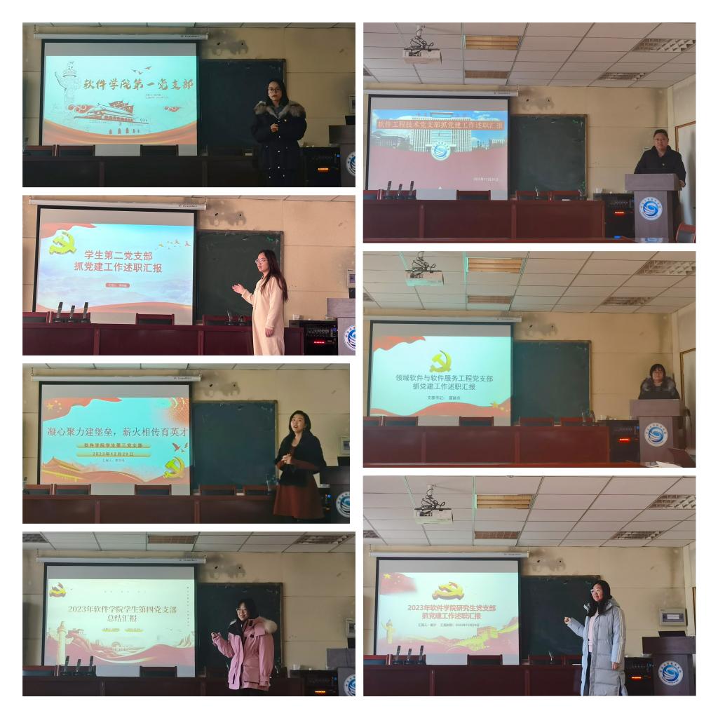 两位教师党支部书记、一位研究生党支部副书记、四位本科生党支部书记分别围绕开展党员学习教育情况、发展党员情况、党员先锋模范作用发挥情况、组织建设、党支部特色工作、存在的问题和下一步工作思路等方面依次进行了现场述职。