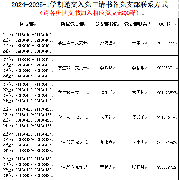 1.以团支部为单位统一收集,各班级团支书于2024年9月25日收齐并审查本班级入党申请书的内容和格式是否符合要求,加入所属党支部QQ群,按照各党支部规定时间提交入党申请书和递交名单汇总表(附件2)。