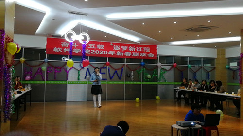 的你和我”致开场词。“过去的一年,我们不忘初心,砥砺前行,过去的一年,我们立德树人,铸师魂,正教风,促学风,引导软件学子努力学习本领,争做爱国、励志、求真、力行的国家栋梁。过去的一年,我们走入企业寻需求,走访名校找差距,参加论坛受启发,校企合作建平台,校外合作引智力……,用全体教职员工的智慧和付出,搭建着学科发展的架构,谋划着软院发展的未来。过去的一年,我们紧跟技术发展前沿,国家级、省级科研项目数保持稳定,科研经费稳步提升;提前布局大数据、人工智能、智慧+、物联网、区块链、网络与信息安全等专业和学科方向、研究生再上新台阶,首次录取5名巴基斯坦留学生;山西省军民融合软件工程技术研究中心建设扎实推进,太空原点区块链研究院签约成立,基于区块链思想,集党团工作、教学、科研、学生工作和日常管理与一体的‘三全育人’学涯服务平台,将成为学院未来厚积薄发的基础。”