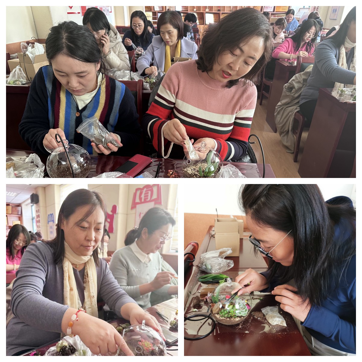工会于学院122会议室组织了一场以“春暖三月,绽放力量”为主题的手工活动——充满创意和趣味的生态瓶DIY。这次活动旨在丰富教职工的闲暇生活,为她们提供一种文化和精神层面的独特体验,同时增进同事间的理解与沟通。