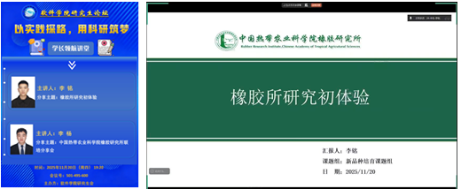 本次论坛以“以实践探路,用科研筑梦”为主题,邀请在中国热带农业科学院橡胶研究所参与联合培养的李铭、李杨两位同学分享实践体验和经验。