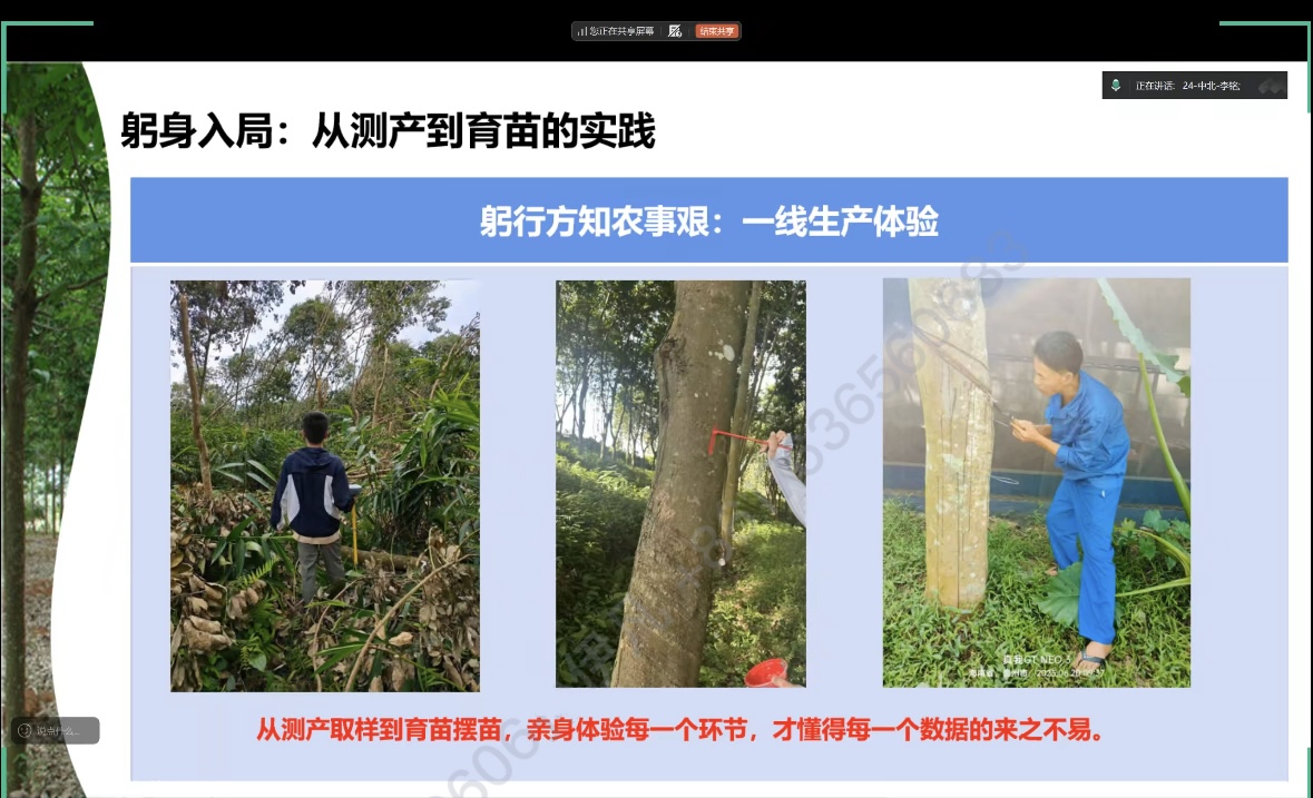 李铭同学从橡胶所的发展历程切入,阐述了天然橡胶作为国家战略资源的重要价值,并且结合自身的点云研究方向,分享了在橡胶树品种培育中的数据采集等科研经历。李杨同学则聚焦“智赋橡胶”的跨界探索,介绍了其搭建蜂鸟物联网平台的技术实践,还分享了从测产取样等田间一线工作到台风灾情调研的亲身经历,最后还分享了他们的联培美好生活。讲解结束后,大家围绕科研、生活等问题积极交流,李铭、李杨两位同学结合自身经历逐一耐心解答,进一步扫清了同学们对该联培的认知疑惑。