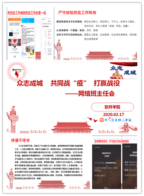 杜瑞平副书记就疫情防控期间的相关政策做了详细介绍,并就第一天学生网络上课的状况进行分析,希望班主任能及时了解学生上课的反馈,与代课老师、辅导员一起形成合力,克服当前困难,为学生学习提供保障和支持。班主任在特殊时期不仅要引导学生将精力投入到学习中,同时要抓住防疫时期讲好爱国主义教育、生命教育、社会责任感教育、规则教育、爱与感恩教育,将班级工作做到防疫工作的第一线。学院教学副院长李众就学生们所关注的上课形式、补考安排、毕业设计等与班主任们进行了交流。各位辅导员老师也就各项专项工作与班主任进行了介绍。