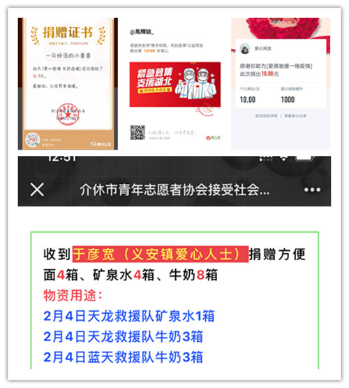 以班级或个人名义通过湖北省慈善总会、武汉市慈善总会、腾讯公益等途径捐款累积7311.81元。18130045班的班长冀凯在班级群QQ群给同学发出新年祝福“请大家待在家中,不外出、不聚会,就是我们彼此最好的祝福”,并发出倡议“给武汉捐款,每一元、每一分都是大家的心意”,一呼而百应,点滴爱心汇成驰援武汉的溪流。17130108于彦宽同学,通过介休市青年志愿者协会捐献了方便面4箱、矿泉水4箱、牛奶8箱。疫情就是集结号,每一分钱、每一件物品都带着温度将同学们的祝福和爱国情怀传递到祖国最需要的地方。