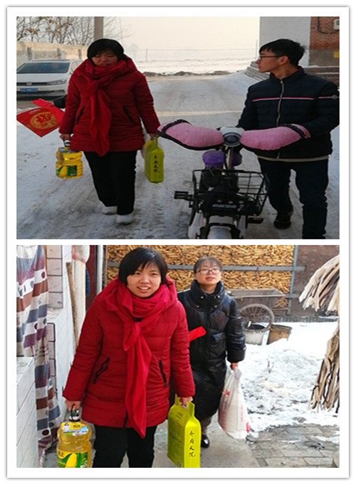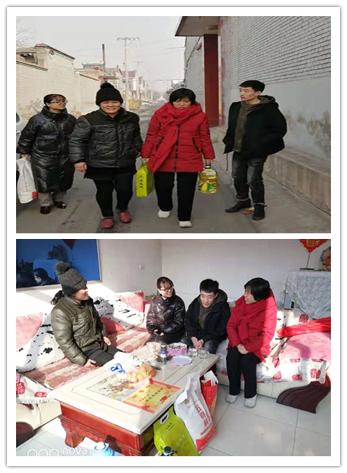 学院党委副书记杜瑞平和辅导员盖海霞首先来到家在东观镇小贾村的贾岳泉同学家里。当老师们出现在家门口时,岳泉和妈妈热情地将老师们引进家里。岳泉的爷爷身体有病在医院住院,刚刚从医院照料爷爷回家的岳泉比别的同学多了份责任和担当,在家里还要帮着家里收拾家准备过年。老师们详细询问了岳泉在学校的学习和生活以及家里的具体情况,并送上随行带的米、面、油慰问品。听说岳泉本学期的成绩优良,老师和岳泉的妈妈非常欣慰,鼓励他努力学习,认真学习专业知识,增强本领。