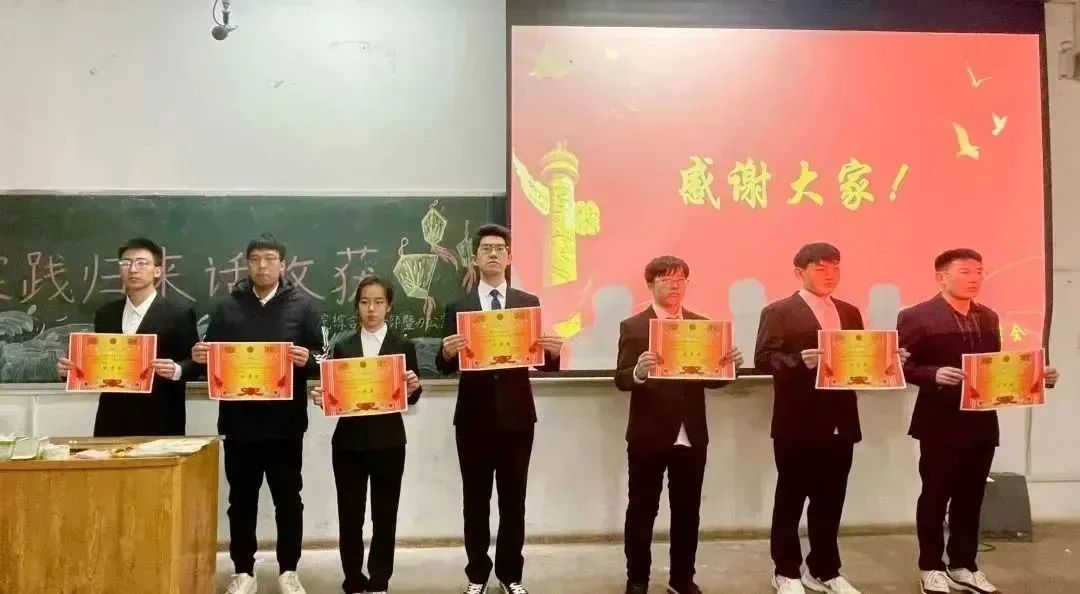 各实践团代表人相继上台进行经验分享与总结汇报,大家聚在一堂话收获、谈体会、享经验,各实践团从探寻红色文化到助力乡村振兴、从聚焦生态热点到调研脱贫成果、从志愿服务活动到中华优秀传统文化,实践活动的着力点始终扎根中国大地,大家在实践锻炼中锤炼意志品质,在服务社会中体现责任担当,用青春活力展现新时代力量。活动最后,院团委为7个实践团颁发了奖状以资鼓励。