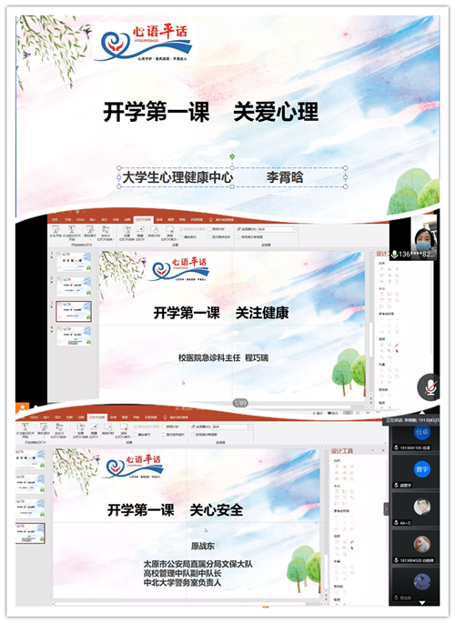 学校大学生心理健康中心的李霄晗老师以《关注返校心理健康》为题,与同学们探讨了返校后的心理、作息时间调整以及调节负性情绪、找回学习动力;校医院急诊科主任程巧瑞医师重点从疫情背景下,学生返校后发热就诊、常见传染病的防治以及秋冬季节的日常保健进行了介绍;太原市公安局直属分局文保大队、高校管理中队副中队长、校警务室负责人原战东警官结合谨防电信诈骗、网络兼职刷单、冒充好友诈骗等案例进行警示教育,提高同学们的防范意识。