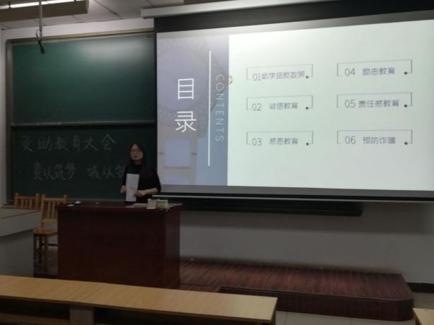 会议分六个议程项目,分别为“助学贷款政策”“诚信教育”“感恩教育”“责任教育”“励志教育”“预防诈骗教育”,为了实现大学生的全面发展和提高思想道德素质、给受国家资助的学生精神上的鼓励促使其不断提升自我与懂得感恩、培养大学生的社会责任感和履行自己的承诺和义务、预防大学生进入诈骗陷阱,辅导员盖海霞老师针对以上六部分内容分别进行了讲解。