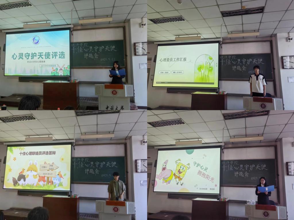 于2024年4月23日下午四点在11312H教室举办2023-2024年度“十佳心灵守护天使暨优秀工作者”评选活动。学院学生科董越男老师、赵艳芳老师、王婷婷老师以及三名学生会学生代表作为评委出席了本次活动。21级、23级各班心理联络员,22级参选的心灵守护天使亲友团120余名同学参加。