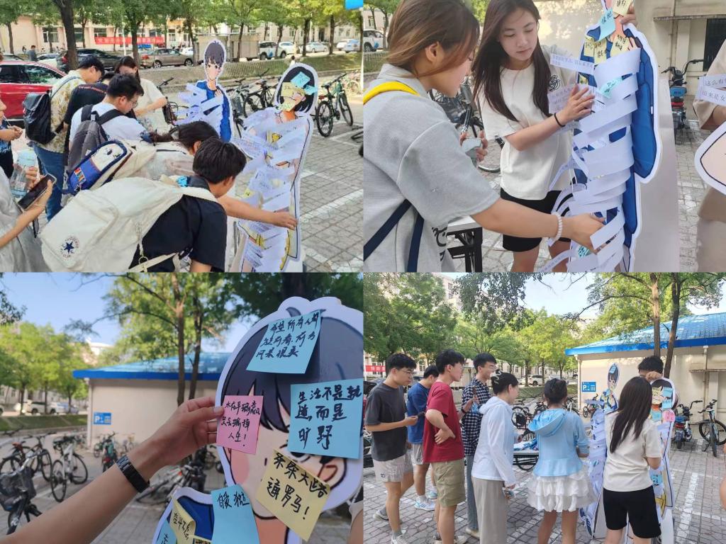 心理站同学在学院门口摆放贴满偏见标签的男女生人形立牌和活动规则海报,鼓励来往同学勇敢撕掉标签,并在便利贴上写下励志的祝福和心愿。