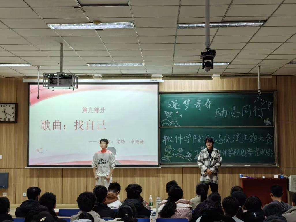 歌曲表演中,音乐响起,同学们用真挚的歌声点燃了现场气氛。《淋雨一直走》传递出无畏困难、勇往直前的坚定信念,歌声中满是青春的蓬勃朝气;《找自己》则带着对自我的探寻与追求,轻快的旋律搭配深情的演唱,引发了台下观众的强烈共鸣,激励着大家在逐梦路上坚守自我、奋勇前行。