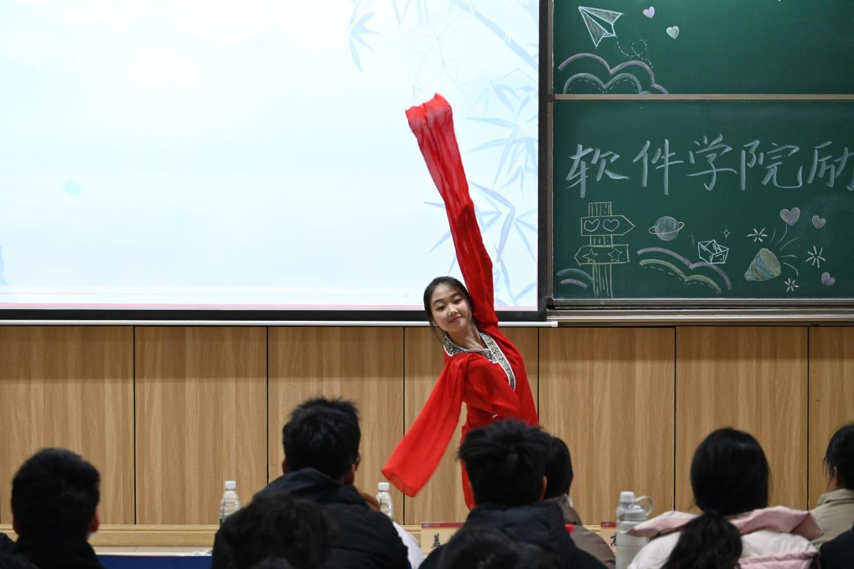 随后,民族舞《采薇》惊艳亮相。舞者身着古装,轻盈的舞姿似穿越千年而来。她举手投足间,将《诗经》中 “采薇采薇” 的诗意与柔美展现得淋漓尽致,舞步灵动,水袖轻扬,为交流会增添了一抹浓郁的文化艺术气息,赢得台下阵阵掌声。