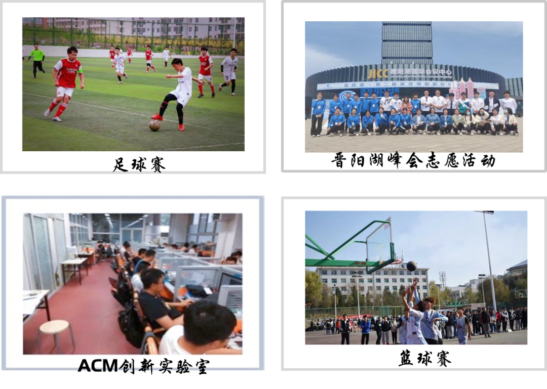 明德善思,积极向上。学院学生在学习生活中积极向上,具有良好的人文素养、职业道德和敬业精神、具有科学严谨、求真务实的学习和工作作风。在踏实严肃的学习氛围下,认真学习之余更有丰富多彩的校园活动。辩论赛、答辩活动、篮球赛、足球赛,大家展示别样自我,突破自我极限;各项文化社会实践和志愿服务活动,如二青会、晋阳湖峰会等大型活动都有学院学子青春的身影;丰富多彩的社团活动、人才济济的实验室,增长知识开阔视野,其中ACM_ICPC程序设计创新实验室、网络行为分析实验室,更是涌现出了一批优秀的队员,并多次参加了亚洲区中国赛区的现场比赛荣获嘉奖。